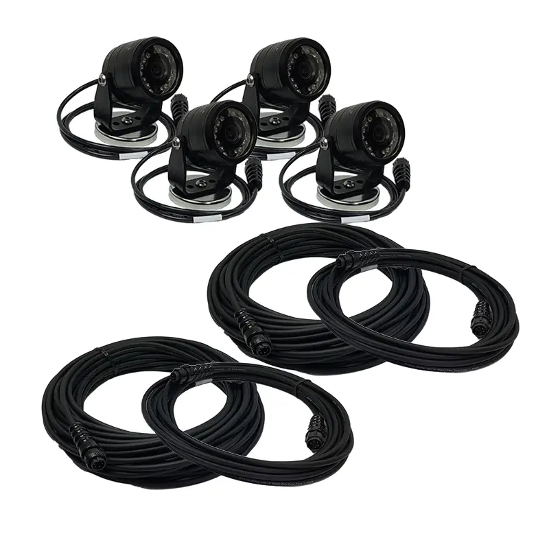 This AGCO AgCam® kit includes four (4) CVBS 92° PAL cameras, two (2) 20’and two (2) 40′ shielded power video flex cables, and accessories.